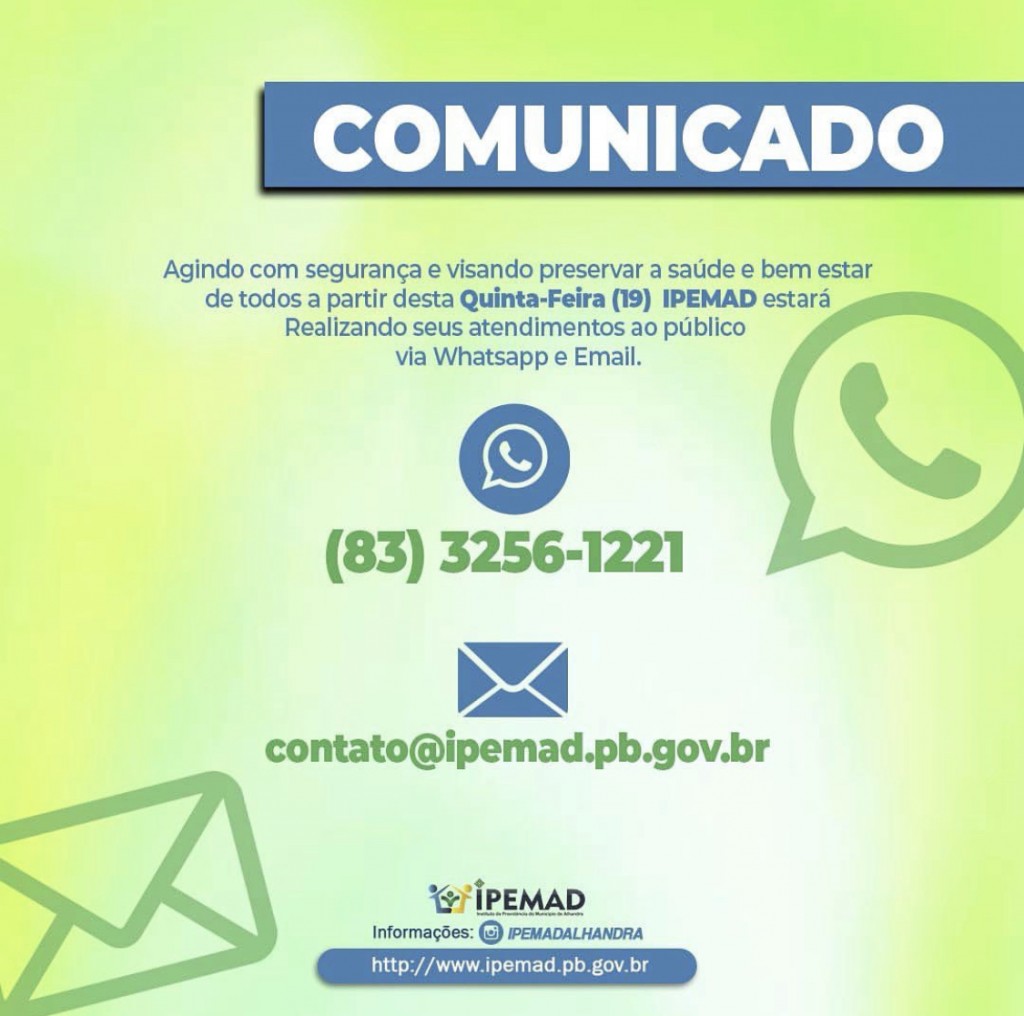 Agindo com segurança e visando preservar a saúde e bem estar de todos e considerando que o público do IPEMAD é composto na maioria de idosos (grupo de risco), a partir desta quinta feira(19), estaremos atendendo as demandas ao público via WhatsApp e Email.