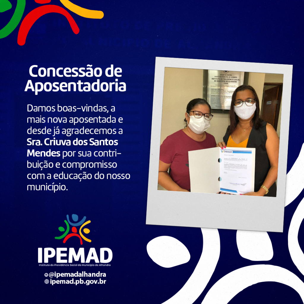 O IPEMAD da boas-vindas a mais nova aposentada e desde já agradecemos a Sra. Criuva dos Santos Mendes por sua contribuição e compromisso com a educação do nosso município.