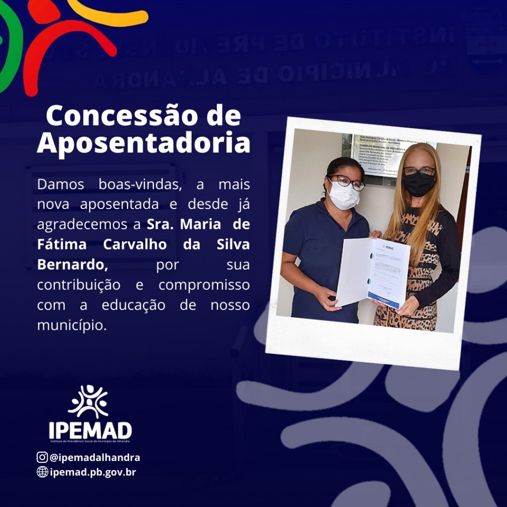 O IPEMAD da boas-vindas a mais nova aposentada e desde já agradecemos a Sra. Maria de Fátima Carvalho da Silva Bernardo por sua contribuição e compromisso com a educação do nosso município.