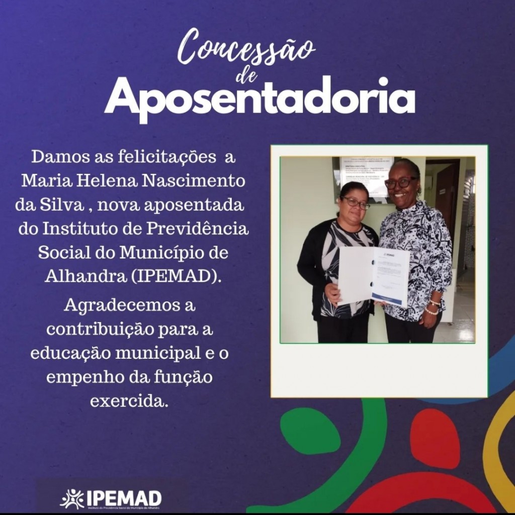 Damos as felicitações a Maria josé de Oliveira, nova aposentada do Instituto de Previdência Social do Município de Alhandra (IPEMAD).