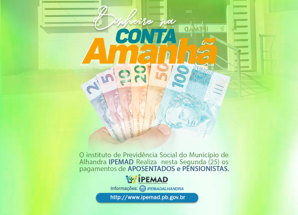 O Instituto de Previdência Social do Município de Alhandra (IPEMAD), realiza pagamento nesta Segunda Feira (25) de Novembro. O pagamento da folha segue dentro do cronograma planejado sempre antes do final de cada mês, esse é mais um compromisso de uma gestão que respeita os aposentados e pensionistas deste município.