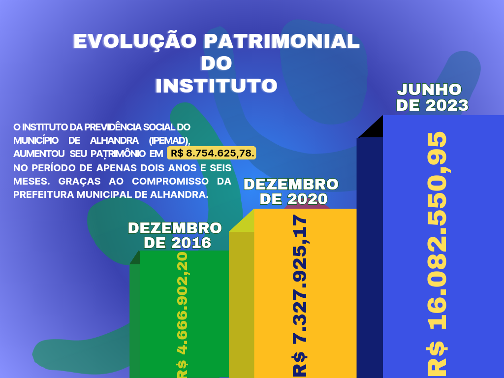 São R$ 8.754.625,78(oito milhões e setecentos e cinquenta e quatro mil e seiscentos e vinte e cinco reais e setenta e oito centavos) em aumento de patrimônio durante o período de 2021 até o momento. Para se ter uma ideia, em 2016 o patrimônio do órgão estava em R$ 4.666.902,20(quatro milhões e seiscentos e sessenta e seis mil e novecentos e dois reais e vinte centavos) e encerrou 2020 com pouco mais de 50% de crescimento, além de inúmeras dívidas e parcelamentos firmados não pagos pela Prefeitura de Alhandra neste período.