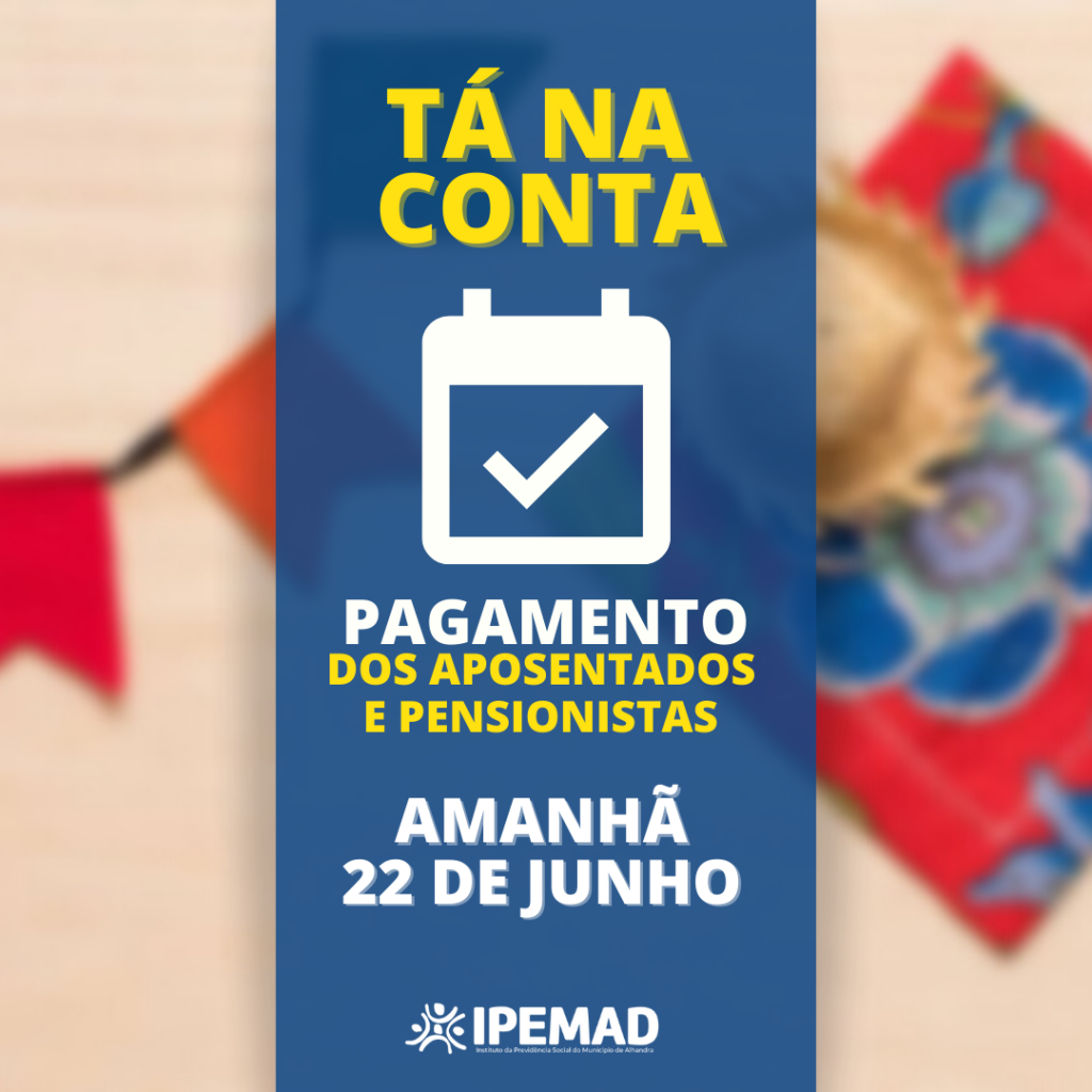 O IPEMAD informa que neste mês de Junho, o pagamento dos aposentados e pensionistas serão antecipados para o dia 22 de junho (amanhã), em decorrência das festividades juninas.