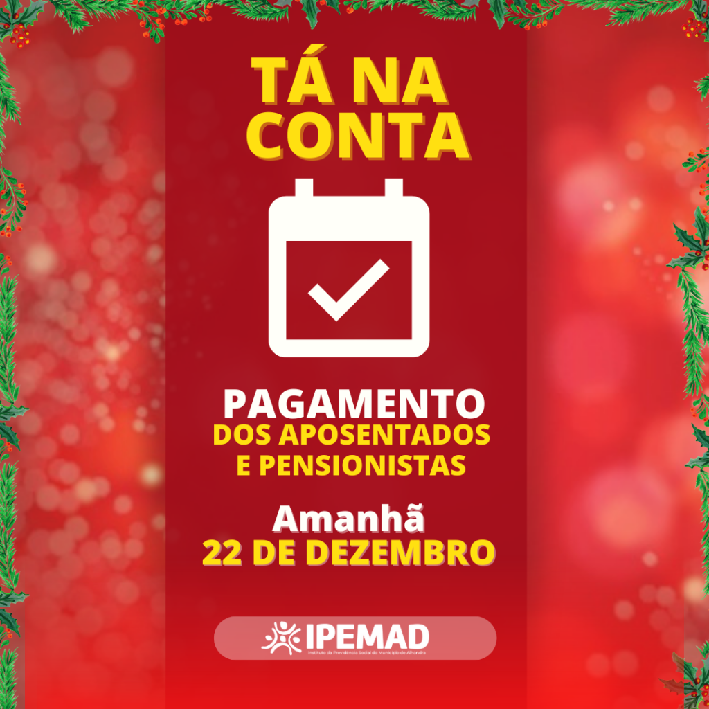 Informamos a todos os nossos aposentados e pensionistas o pagamento do salário de Dezembro no dia 22/12/2022. Devido as festividades antecipamos o o dia.