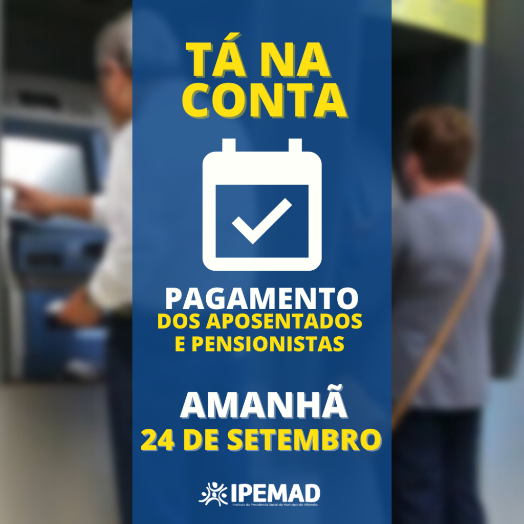 O IPEMAD informa que neste mês de Setembro, o pagamento dos aposentados e pensionistas serão antecipados para o dia 24 de setembro (amanhã).