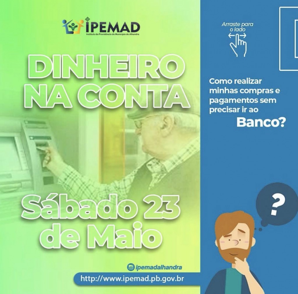 Neste sábado dia 23 de maio, estaremos realizando o pagamento dos aposentados e pensionistas, e aproveitamos a oportunidade para lembra-los que não precisam se dirigir ao banco para realizar suas compras e pagamentos, evitem filas e aglomerações! estamos vivendo dias dificeis, e em breve voltaremos a normalidade com a colaboração de todos.