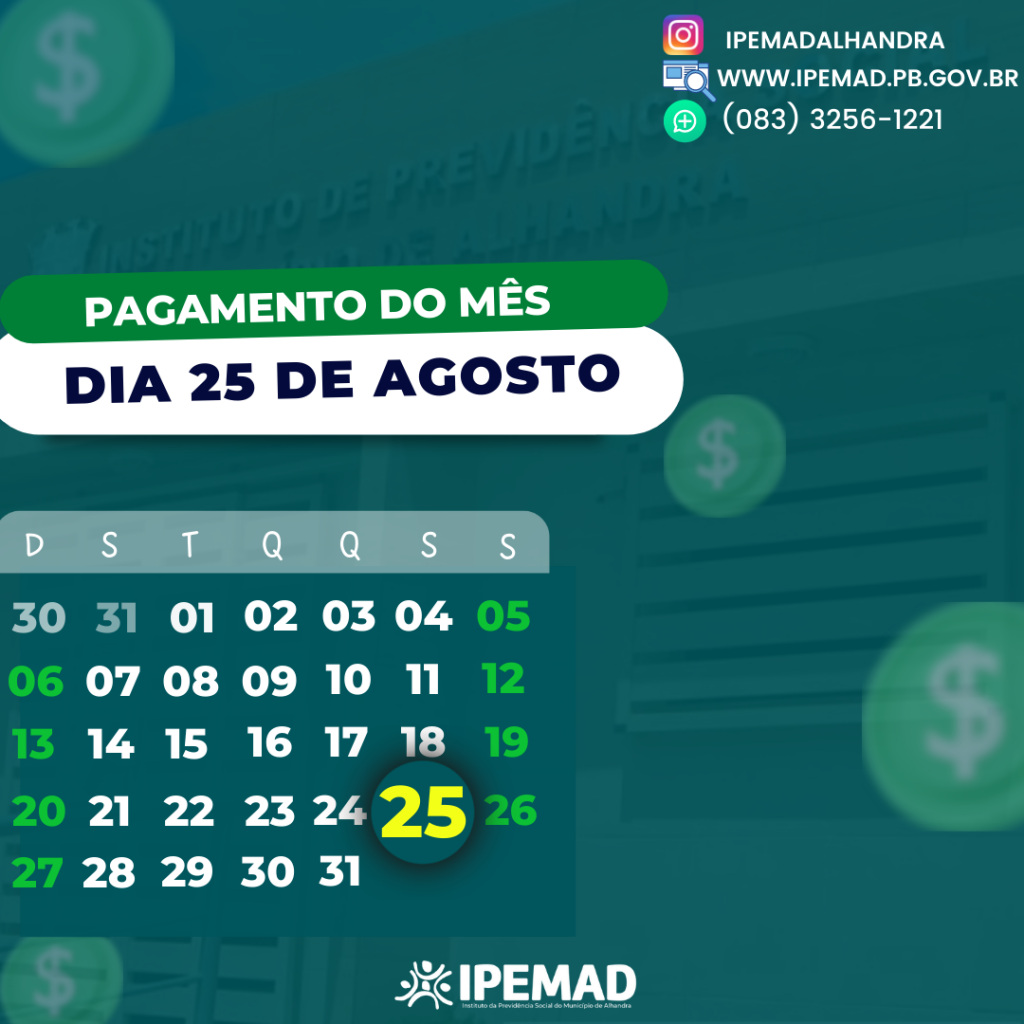 Comunicamos aos nossos aposentados e pensionistas o pagamento referente ao mês de agosto, nessa sexta-feira, dia 25.