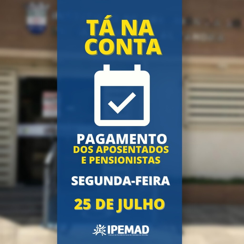 O Instituto de Previdência Social do Municipio de Alhandra - PB ( IPEMAD), informa que o pagamento do mês de julho acontecerá dia 25/07/2022. Honrando o compromisso com os segurados.