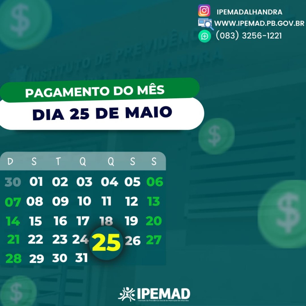 Informamos o pagamento dos aposentados e pensionistas do IPEMAD nessa Quinta-feira, 25/05/2023. Honrando o compromisso com os nossos segurados.