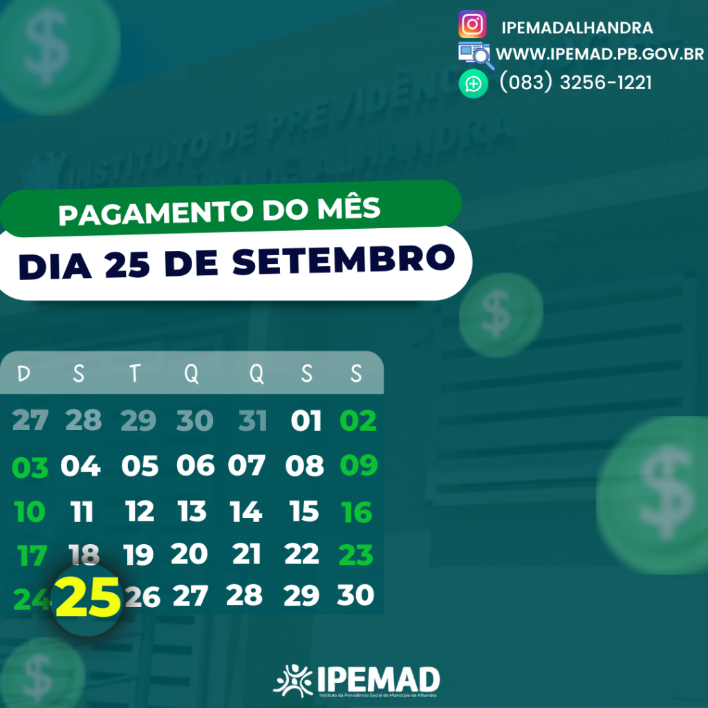 informamos aos nossos aposentados e pensionistas o pagamento do mês de setembro na segunda-feira, dia 25/09. Honrando o compromisso com nossos segurados.