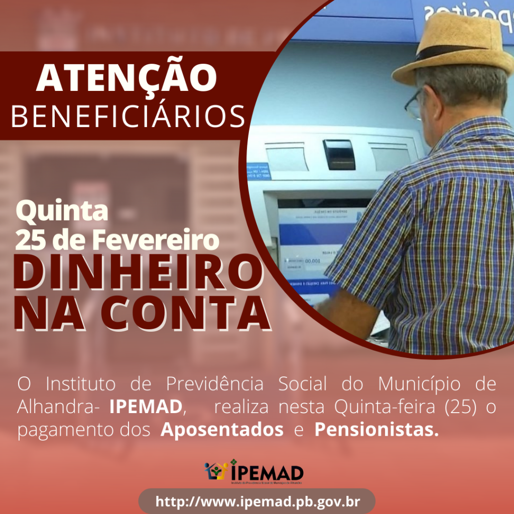 Nesta Quinta-feira (25) estaremos realizando o pagamento dos aposentados e pensionistas, e aproveitando a oportunidade para lembra-los que
