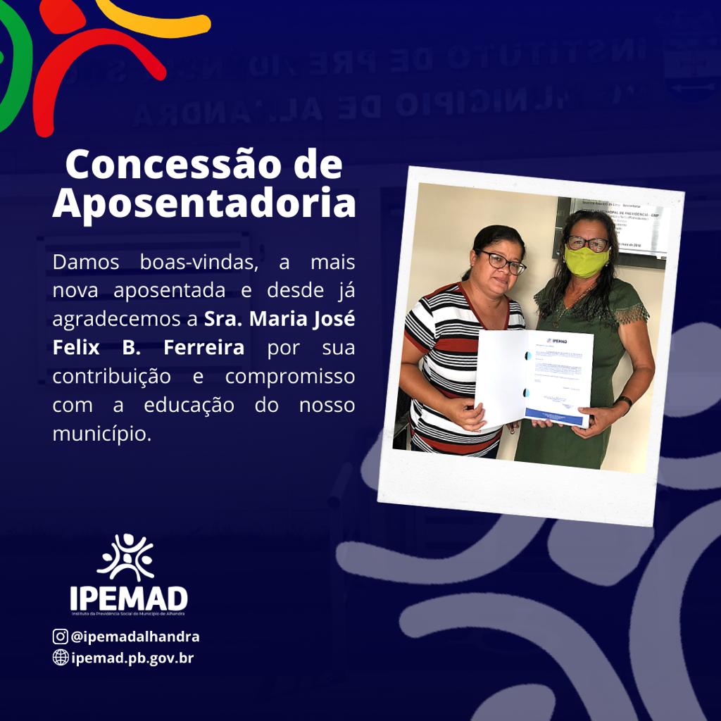 O IPEMAD da boas-vindas a mais nova aposentada e desde já agradecemos a Sra. Maria José Felix B. Ferreira por sua contribuição e compromisso com a educação do nosso município.