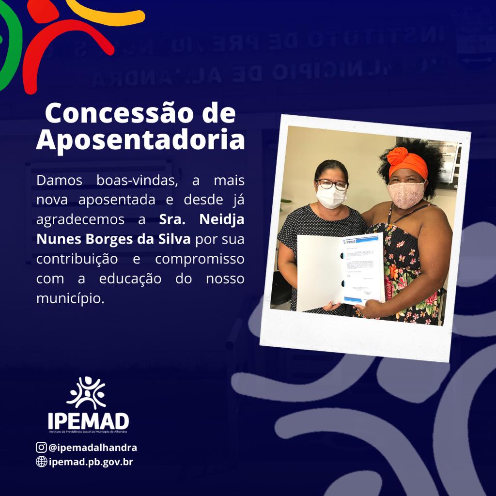O IPEMAD da boas-vindas a mais nova aposentada e desde já agradecemos a Sra. Neidja Nunes Borges da Silva por sua contribuição e compromisso com a educação do nosso município.