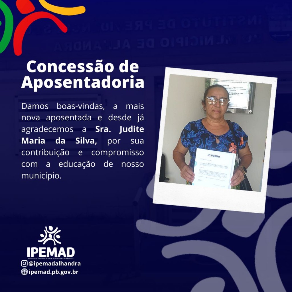 O IPEMAD da boas-vindas a mais nova aposentada e desde já agradecemos a Sra. Judite Maria da Silva por sua contribuição e compromisso com nosso município.