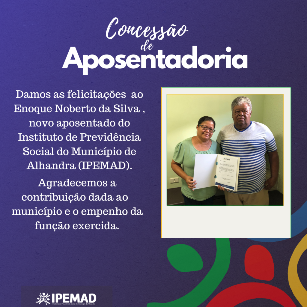 Comunicamos com muita alegria a concessão de aposentadoria do senhor Enoque Noberto, agradecemos a contribuição dada ao município e o empenho da função exercida, desejamos uma longa e feliz aposentadoria!