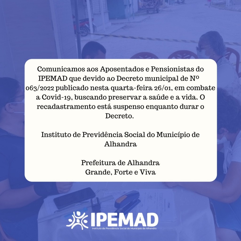 Comunicamos aos Aposentados e Pensionistas do IPEMAD que devido ao Decreto municipal de Nº 063/2022 publicado dia 26/01, em combate a Covid-19, buscando preservar a saúde e a vida. O recadastramento está suspenso enquanto durar o Decreto.